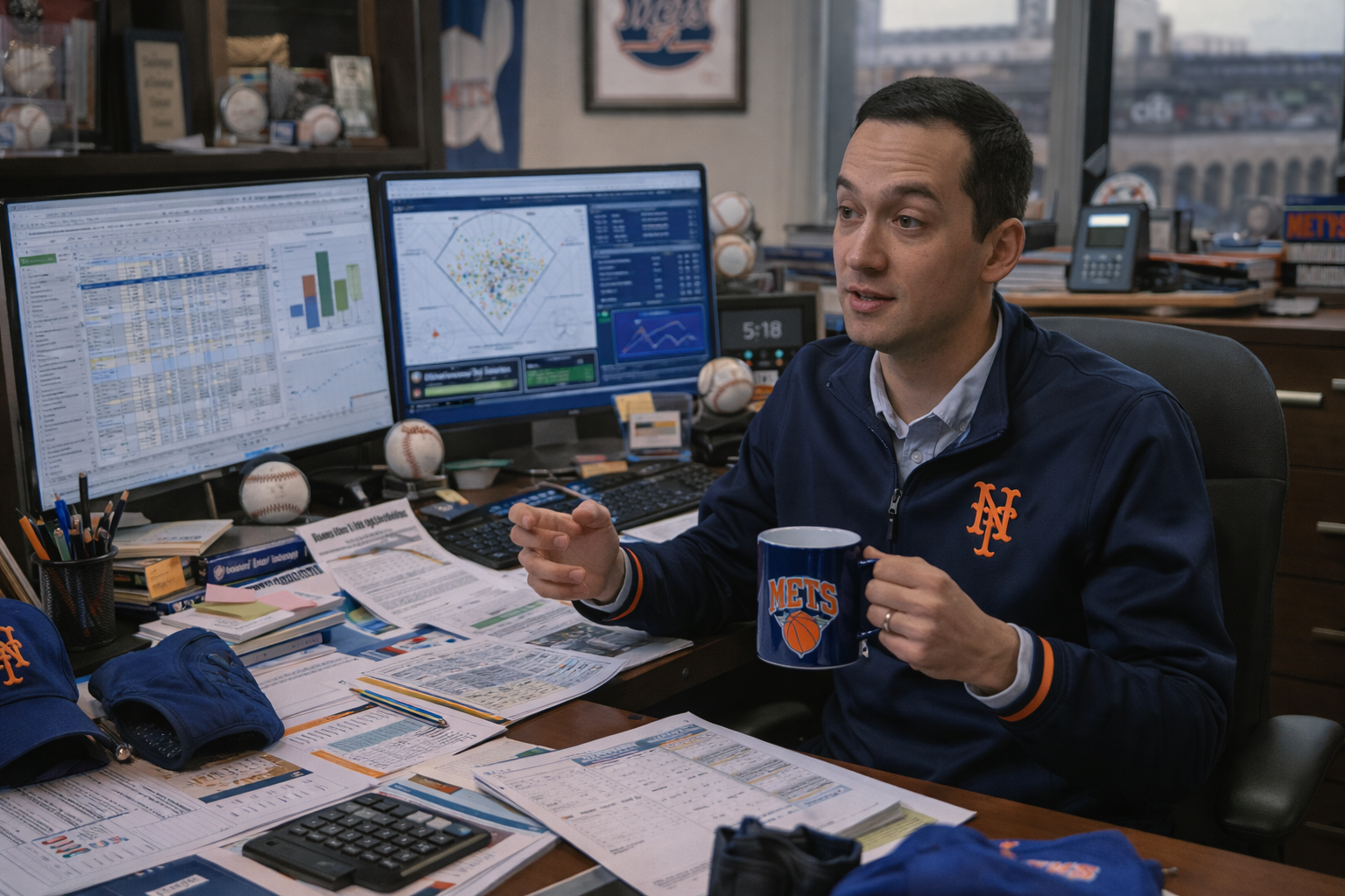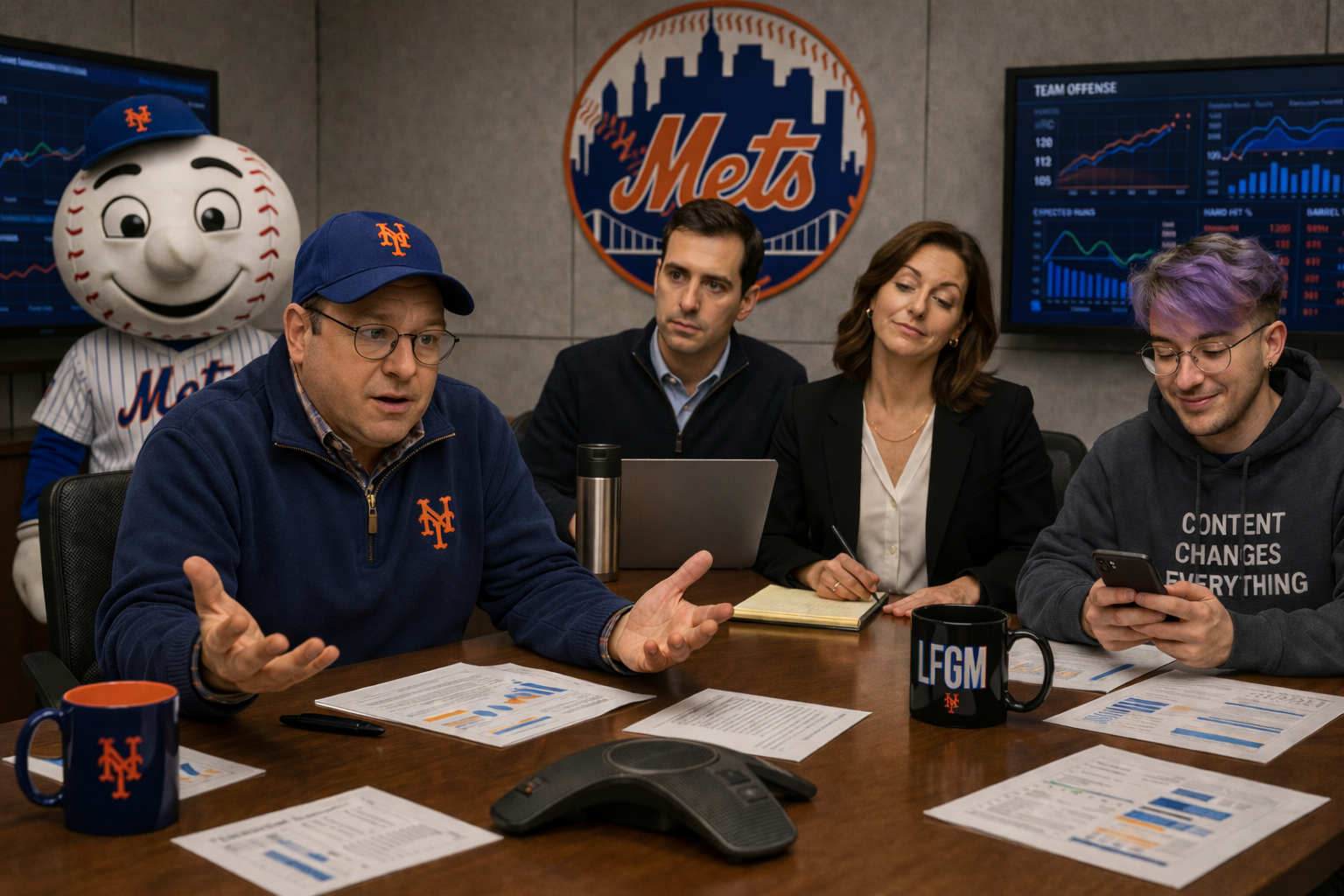 A long table. STEVE at the head, exhausted. DAVID has a laptop open with charts. LAUREN from communications sits upright with a notebook. CHAD the social media intern is already on his phone. MR. MET just stares, smiling.